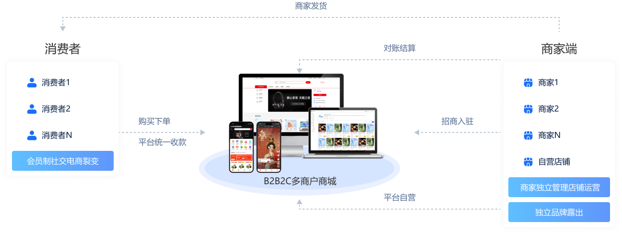 专为企业打造“平台+多商户”协同运营的电商生态,支持平台自营+第三方店铺入驻混合模式,实现商品、订单、资金、数据的全链路统一管理。